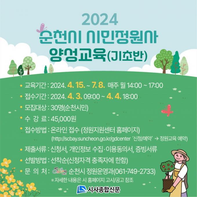 ½ÉÈ °úÁ¤Àº ±âÃʰúÁ¤À» À̼öÇÑ ½Ã¹Î 30¸íÀ» ´ë»óÀ¸·Î, 4¿ù 17ÀϺÎÅÍ 7¿ù 10ÀϱîÁö ¸ÅÁÖ ¼ö¿äÀÏ¿¡ ÁøÇàµÇ¸ç, Á¤¿ø °ü¸®¿¡ °üÇÑ ÀÌ·Ð ¹× ½Ç½À ±³À°À» ½ÃÇàÇÑ´Ù. ¸ðÁý°ø°íÀÏ ÇöÀç ¼øÃµ¿¡ Áֹεî·ÏÀ» µÐ ½Ã¹ÎÀ̶ó¸é ´©±¸³ª ½ÅûÇÒ ¼ö ÀÖÀ¸¸ç 4¿ù 3ÀϺÎÅÍ 4¿ù 4ÀϱîÁö ¼øÃµ½Ã Á¤¿øÁö¿ø¼¾ÅÍ È¨ÆäÀÌÁö ¡®Á¤¿ø±³À° ¿¹¾à½Ã½ºÅÛ(https://scbay.suncheon.go.kr/gdcenter)¡¯À» ÅëÇØ Á¢¼öÇÒ ¼ö ÀÖ´Ù.