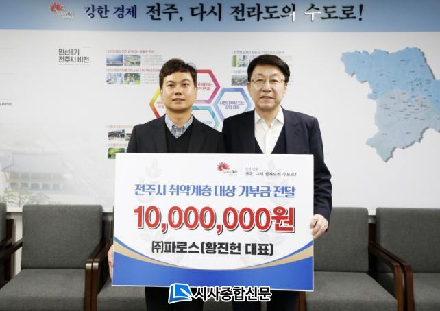 [½Ã»çÁ¾ÇսŹ® = ±è¿¬Èñ ±âÀÚ] ÀüÁֽô 28ÀÏ ÁÖ½Äȸ»ç ÆÄ·Î½º(´ëÇ¥ ȲÁøÇå)°¡ ÀüÁÖÁö¿ªÀÇ ¼Ò¿ÜµÈ ÀÌ¿ôÀ» À§ÇÑ ¼º±Ý 1000¸¸ ¿øÀ» ±âºÎÇß´Ù°í ¹àÇû´Ù.