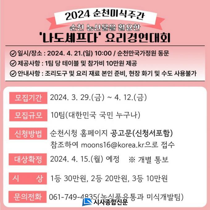 Âü°¡±Ô¸ð´Â 10ÆÀÀ¸·Î ¼øÃµ½Ã¹Î ¹× ±¹°¡Á¤¿øÀ» ã´Â °ü±¤°´ µî ´©±¸³ª Âü¿©ÇÒ ¼ö ÀÖÀ¸¸ç ¼±Âø¼ø¿¡ ÀÇÇØ Âü°¡ÀÚ°¡ È®Á¤µÇ°í, 4¿ù 21ÀÏ ¼øÃµ¸¸±¹°¡Á¤¿ø µ¿¹®¡¸2024 ¼øÃµ¹Ì½ÄÁÖ°£¡¹Çà»çÀå ³»¿¡¼ ÇöÀå °æ¿¬À» ÅëÇØ ¼ö»óÀÚ°¡ °áÁ¤µÈ´Ù.