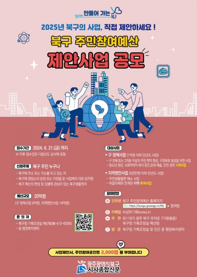 ºÏ±¸´Â °ø¸ð¿¡ Âü¿©ÇÑ Áֹο¡°Ô ÁÖ¹ÎÂü¿© Æ÷ÀÎÆ®(±¸Á¤ Âü¿© ÁֹΠ´ë»ó Æ÷ÀÎÆ® ºÎ¿© ¹× 1¸¸ Á¡ ÀÌ»ó Àû¸³ ½Ã ÇØ´ç Á¡¼ö¿Í »ó´çÇÑ »óǰ±Ç Áö±Þ Á¦µµ) 2õ Á¡À» ºÎ¿©Çϰí 10¿ù±îÁö °¢ ºÎ¼ÀÇ Àû°Ý¼º °ËÅä¿Í ÃѰýÅä·Ðȸ ½ÉÀǸ¦ °ÅÃÄ Á¢¼öµÈ Á¦¾È Áß ÁÖ¹ÎÂü¿©¿¹»ê»ç¾÷À» ÃÖÁ¾°áÁ¤ÇÏ¿© ³»³âµµ º»¿¹»ê¿¡ ¹Ý¿µÇÒ °èȹÀÌ´Ù.