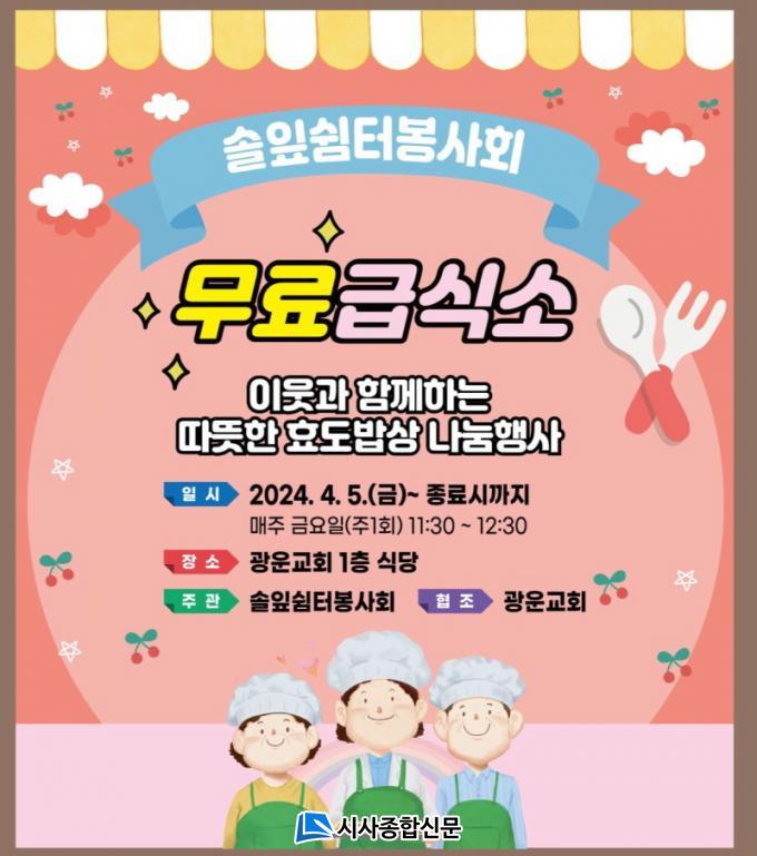 4ÀÏ ºÏ±¸¿¡ µû¸£¸é ÀÌ´ÞºÎÅÍ ¿î¾Ïµ¿¿¡ ¼ÒÀçÇÑ ¡®±¤¿î±³È¸(´ãÀÓ¸ñ»ç À̳²±Ô)¡¯¿¡¼ ¹Î°£ ÈÄ¿øÀ» ±â¹ÝÀ¸·Î ÇÑ ¡®¼ÖÀÙ½°ÅͺÀ»çȸ ÁÖ°ü ¹«·á ±Þ½Ä¼Ò¡¯ ¿î¿µÀÌ °³½ÃµÈ´Ù.