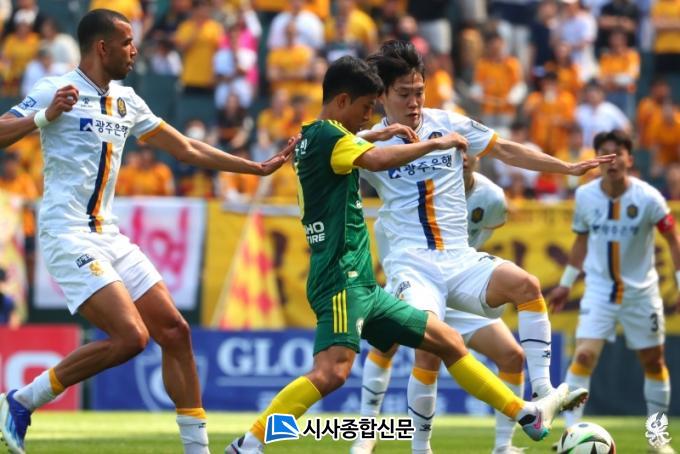 ±¤ÁÖ°¡ Àý½ÇÈ÷ ±â´Ù¸®´ø µ¿Á¡°ñ ±âȸ°¡ ã¾Æ¿Ô´Ù. ÈÄ¹Ý 38ºÐ Á¤È£¿¬ÀÌ ¿Þ¹ß·Î °¨¾Æ Âù Å©·Î½º°¡ °ñ¹®À¸·Î ÇâÇß´Ù. ÀüºÏ °ñŰÆÛ°¡ °¡±î½º·Î ÃijÂÁö¸¸, À̰ÇÈñ°¡ °ÇÏ°Ô Â÷ ³ÖÀ¸¸ç 1´ë 1 µ¿Á¡À» ¸¸µé¾ú´Ù. °æ±â ºÐÀ§±â´Â ¿ÏÀüÈ÷ ±¤ÁÖ¿¡ ³Ñ¾î¿À´Â µíÇß´Ù.