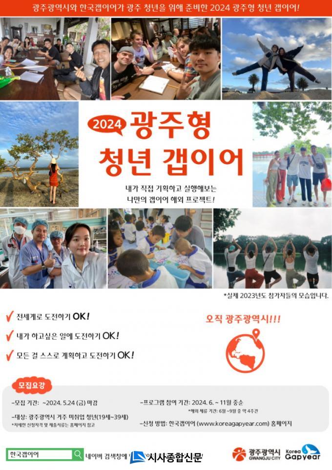 ±¤ÁÖ±¤¿ª½Ã(½ÃÀå °±âÁ¤)´Â Áö¿ª û³âµéÀÇ Çо÷°ú Ãë¾÷ °úÁ¤¿¡¼ ¹ß»ýÇÏ´Â °¸(Gap) ±â°£À» µµ¾àÀÇ ±âȸ·Î »ïÀ» ¼ö ÀÖµµ·Ï ´Ù¾çÇÑ À¯ÇüÀÇ ÇØ¿Ü û³â°¸À̾î Ȱµ¿À» Áö¿øÇÏ´Â ¡®2024 ±¤ÁÖÇü û³â°¸ÀÌ¾î »ç¾÷¡¯ÀÇ Âü¿© ½ÅûÀ» ¹Þ´Â´Ù.