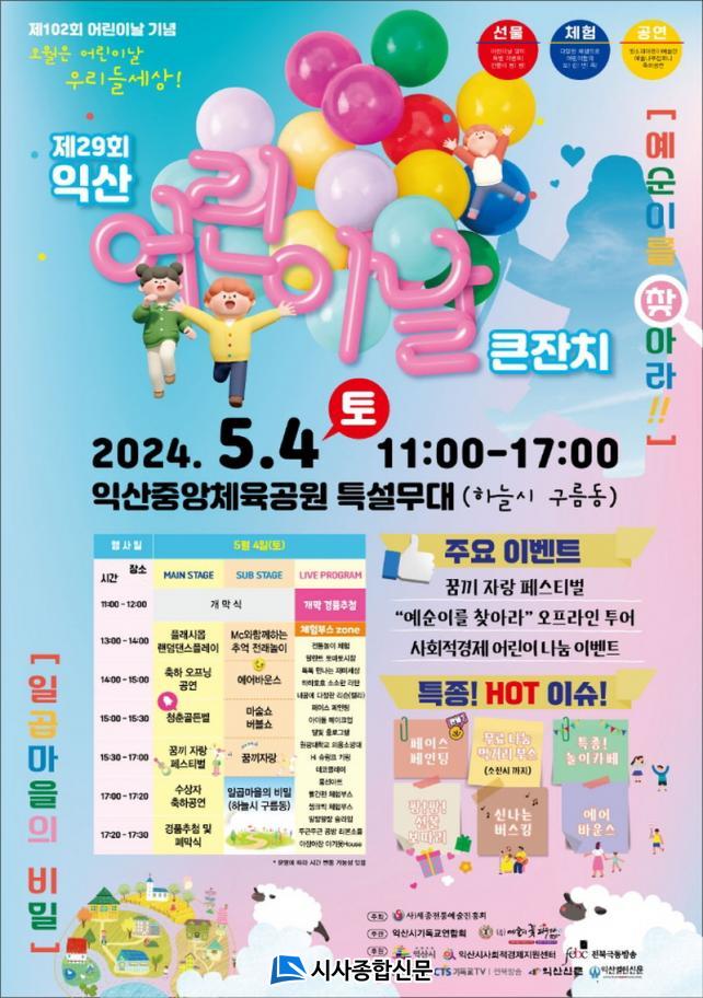 Á¦102ȸ ¾î¸°À̳¯À» ¸Â¾Æ ´ÙÀ½ ´Þ 4Àϰú 5ÀÏ ÀÍ»ê °÷°÷¿¡¼ ´Ù¾çÇÑ ¾î¸°ÀÌ Çà»ç°¡ °³ÃֵȴÙ.4ÀÏ¿¡´Â ©Å¼¼Á¾ÀüÅ뿹¼úÁøÈïȸ(´ëÇ¥ Á¶Åë´Þ) ÁÖ°üÀ¸·Î Áß¾ÓüÀ°°ø¿ø¿¡¼ ¿ÀÀü 11½ÃºÎÅÍ 'Á¦29ȸ ÀÍ»ê ¾î¸°À̳¯ Å«ÀÜÄ¡'°¡ ¿¸°´Ù.