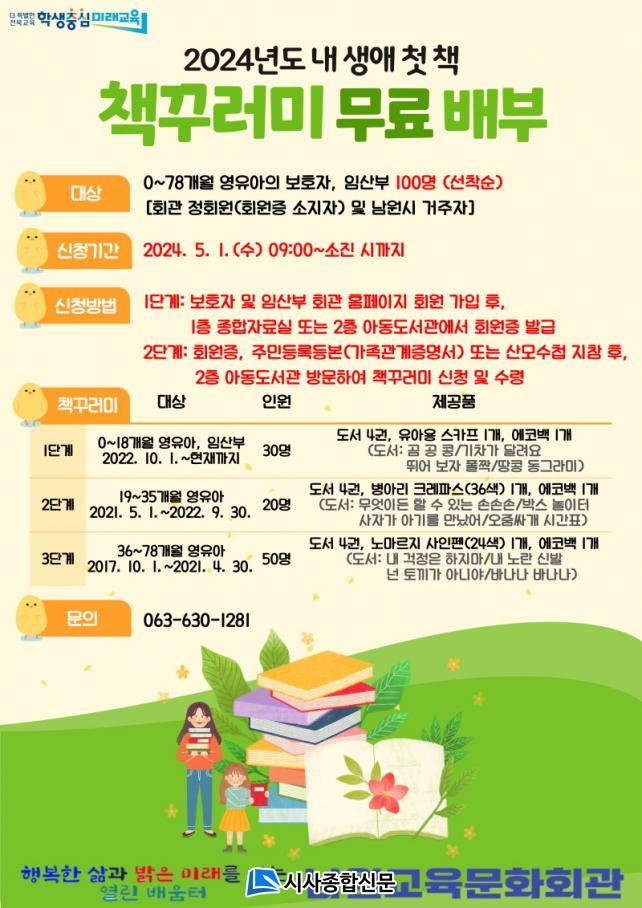 [½Ã»çÁ¾ÇսŹ® = ±è¿¬Èñ ±âÀÚ] ³²¿ø±³À°¹®Èȸ°ü(°üÀå ¹Ú¼öÁø)Àº »ý¾Ö Ãʱ⠵¶¼ ½À°ü Çü¼º¿¡ ±â¿©ÇϰíÀÚ ¿À´Â 5¿ù 1ÀϺÎÅÍ 6¿ù 20ÀϱîÁö ³²¿ø½Ã¿¡ °ÅÁÖÇϰí ÀÖ´Â 0~78°³¿ù ¿µÀ¯¾Æ¿Í º¸È£ÀÚ ¹× ÀÓ»êºÎ¸¦ ´ë»óÀ¸·Î 2024³âµµ ³» »ý¾Ö ù Ã¥À» ¿î¿µÇÒ ¿¹Á¤ÀÌ´Ù.