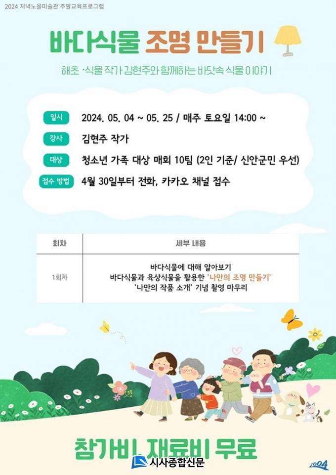 À̹ø ÇÁ·Î±×·¥Àº ÁÖ¸»¿¡ ÀÌ·ç¾îÁö´Â ±³À°À¸·Î ¿À´Â 5¿ù 4ÀÏ(Åä)ºÎÅÍ 26ÀÏ(Åä)±îÁö ¸ÅÁÖ Åä¿äÀÏ 14½ÃºÎÅÍ ÁøÇàÇϸç, Âü°¡ºñ´Â ¹«·á·Î ¸Åȸ û¼Ò³â °¡Á· 10ÆÀÀ» ¸ðÁýÇÑ´Ù. ÁÖ¿ä ³»¿ëÀ¸·Î ¹Ù´Ù½Ä¹°¿¡ ´ëÇØ ¾Ë¾Æº¸°í ¹Ù´Ù½Ä¹°°ú À°»ó½Ä¹°À» Ȱ¿ëÇÏ¿© ¡®³ª¸¸ÀÇ Á¶¸í ¸¸µé±â¡¯°¡ ¿î¿µµÈ´Ù.