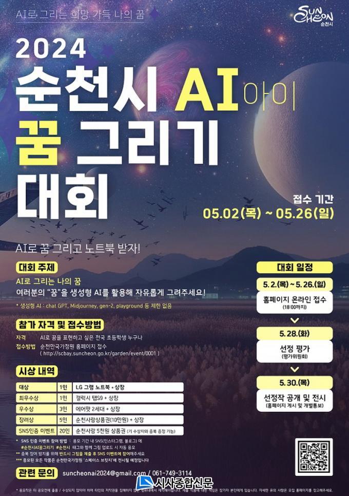 ´ëȸ ÁÖÁ¦´Â ¡¸AI·Î ³» ²ÞÀ» ±×¸®´Ù¡¹·Î êGPT, ¹ÌµåÀú´Ï µî »ý¼ºÇü AI¸¦ ÀÌ¿ëÇØ ³» ²ÞÀ» ÀÚÀ¯·Ó°Ô ±×·Á ¼øÃµ¸¸±¹°¡Á¤¿ø ȨÆäÀÌÁö(https://scbay.suncheon.go.kr/garden/event/0001)¿¡ ÀÛǰÀ» Á¦ÃâÇÏ¸é µÈ´Ù.