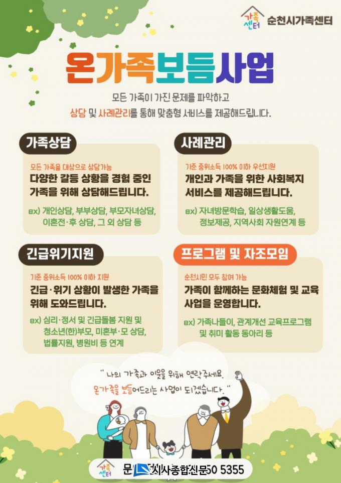 ÇÑÆí, ¡®¿Â°¡Á·µ¹º½»ç¾÷¡¯ÀÇ Á¾·ù ¹× ½Åû°ú °ü·ÃµÈ ÀÚ¼¼ÇÑ »çÇ×Àº ¼øÃµ½Ã°¡Á·¼¾ÅÍ È¨ÆäÀÌÁö(https://suncheon.familynet.or.kr)¸¦ ÅëÇØ È®ÀÎÇÒ ¼ö ÀÖ´Ù.