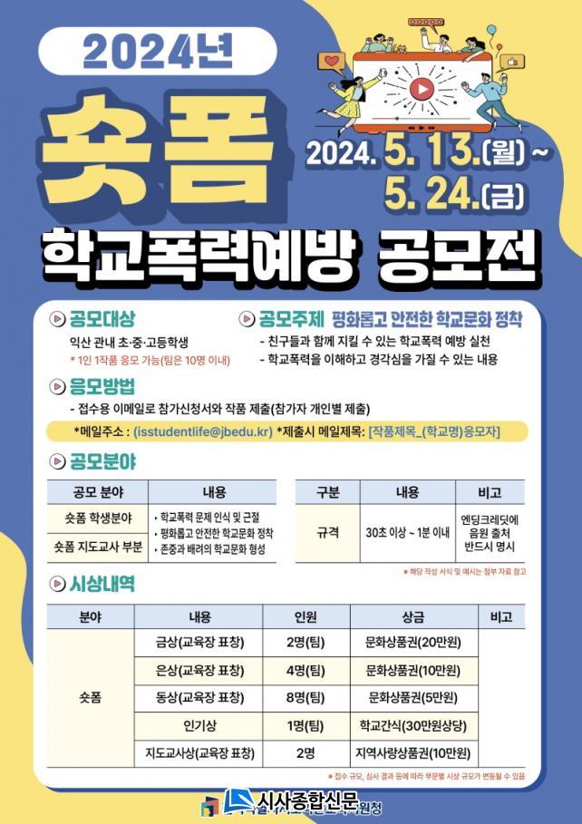 À̹ø Çб³Æø·Â¿¹¹æ ¼ôÆû °ø¸ðÀüÀº Çлý ¹× Áöµµ±³»ç ºÎ¹®À¸·Î ³ª´©¾î ÁøÇàÇÏ¸ç °³ÀÎ ¶Ç´Â ÆÀ 10ÀÎ À̳» ±¸¼ºÀ¸·Î ½Åû °¡´ÉÇÏ´Ù. ÀÛǰ Á¢¼ö´Â 13ÀÏ(¿ù)ºÎÅÍ 5¿ù 24ÀÏ(±Ý)±îÁö À̸ÞÀÏ(isstudentlife@jbedu.kr)·Î Á¦ÃâÇÏ¸é µÈ´Ù.