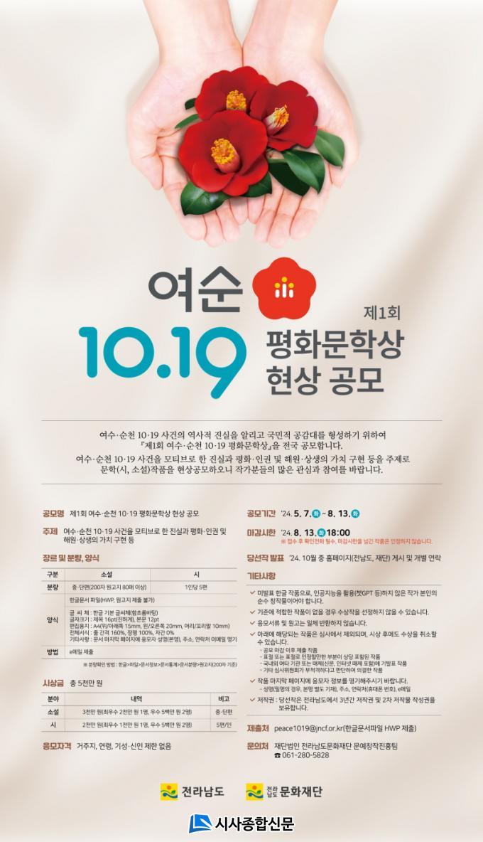 (Àç)Àü¶ó³²µµ¹®ÈÀç´Ü ÁÖ°üÀ¸·Î ÁøÇàÇÏ´Â 10¡¤19Æòȹ®ÇÐ»ó °ø¸ð ´ë»óÀº ½Ã¿Í ¼Ò¼³ 2°³ ºÎ¹®ÀÌ´Ù. ÁÖÁ¦´Â ¿©¼ö¡¤¼øÃµ 10¡¤19»ç°ÇÀ» ¸ðƼºê·Î ÇÑ Áø½Ç°ú ÆòÈ¡¤À뱂 ¹× ÇØ¿ø¡¤»ó»ýÀÇ °¡Ä¡ ±¸Çö µîÀÌ´Ù.
