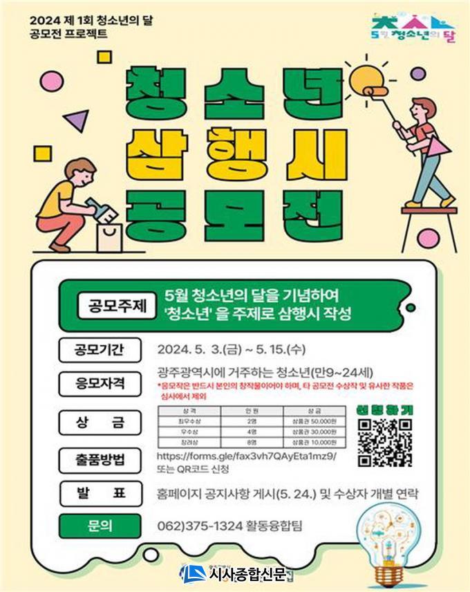 ¡®Ã»¼Ò³â »ïÇà½Ã¡¯ °ø¸ðÀü¿¡ °üÇÑ ÀÚ¼¼ÇÑ »çÇ×Àº ±¤ÁÖ±¤¿ª½ÃÈÁ¤Ã»¼Ò³â¹®ÈÀÇÁý ȨÆäÀÌÁö(gjyc.or.kr) ¹× °ø½Ä SNS¸¦ Âü°íÇϰųª ±¤ÁÖ±¤¿ª½ÃÈÁ¤Ã»¼Ò³â¹®ÈÀÇÁý Ȱµ¿À¶ÇÕÆÀ(062-375-1324)¿¡¼ È®ÀÎÇÒ ¼ö ÀÖ´Ù.