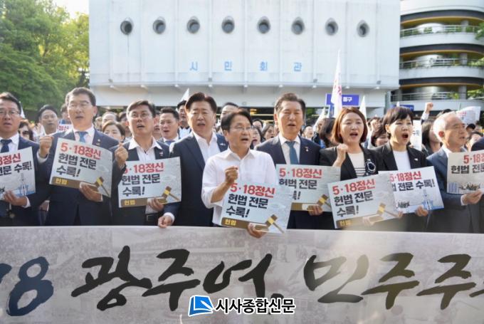 ÇàÁø¿¡ ¾Õ¼ Âü°¡ÀÚµéÀº ¡®5¡¤18 ³ª´®°ú ¿¬´ë¡¯ÀÇ »ó¡ÀÎ ÁÖ¸Ô¹äÀ» ³ª´² ¸Ô¾ú°í, ¡®ÀÓÀ» À§ÇÑ ÇàÁø°î¡¯°ú ¡®±¤ÁÖÃâÀü°¡¡¯ µîÀ» ¹è¿ì¸ç ¹ÎÁÖÆòÈ´ëÇàÁø¿¡ ´ëÇÑ ÀÇÁö¸¦ ´ÙÁ³´Ù. ƯÈ÷ Áö³ 1ÀÏ °øÆ÷ÇÑ 5¡¤18ÅëÇÕÁ¶·Ê¿¡ ´ã±ä ¿À¿ùÁ¤½Å °è½ÂÀÇ Ã¹ ¹øÂ° °úÁ¦ÀÎ ¡®5¡¤18Á¤½Å Çå¹ý Àü¹® ¼ö·Ï¡¯ ¸Þ½ÃÁö¸¦ ½Ã¹Î ¸ðµÎ Çϳª µÇ¾î ¿ÜÃÆ´Ù. ½Ã¹ÎµéÀº Àηù º¸ÆíÀÇ °¡Ä¡¿Í ÀÌ»ó¿¡ ¸Â´ê¾Æ ÀÖ´Â 5‧18Á¤½ÅÀÇ Çå¹ý Àü¹® ¼ö·ÏÀ» °ÇÏ°Ô Ã˱¸Çß´Ù.