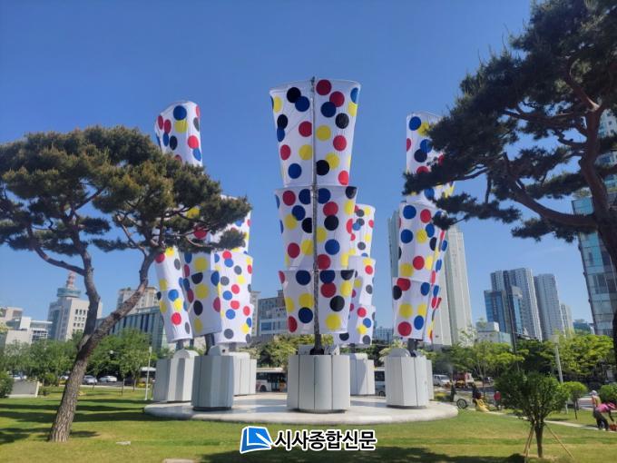 ½Ãû ¾Õ ½Ã¹Î±¤Àå¿¡ ÀÚ¸®ÇÑ ¡®±â¿ø¡¯Àº ³ôÀÌ 16mÀÇ ÃÊ´ëÇü ¸ðºôÀÛÀ¸·Î, ºûÀÇ µµ½Ã ±¤ÁÖ¸¦ Çü»óÈÇÑ 7°³ÀÇ ¸ðºô½Ä ¿øÇü ¿ÀºêÁ¦¿¡ ½Ã¹Î °³°³ÀÎÀÇ ¿°¿øÀ» ´ã¾Æ³»°í ÀÖ´Ù.