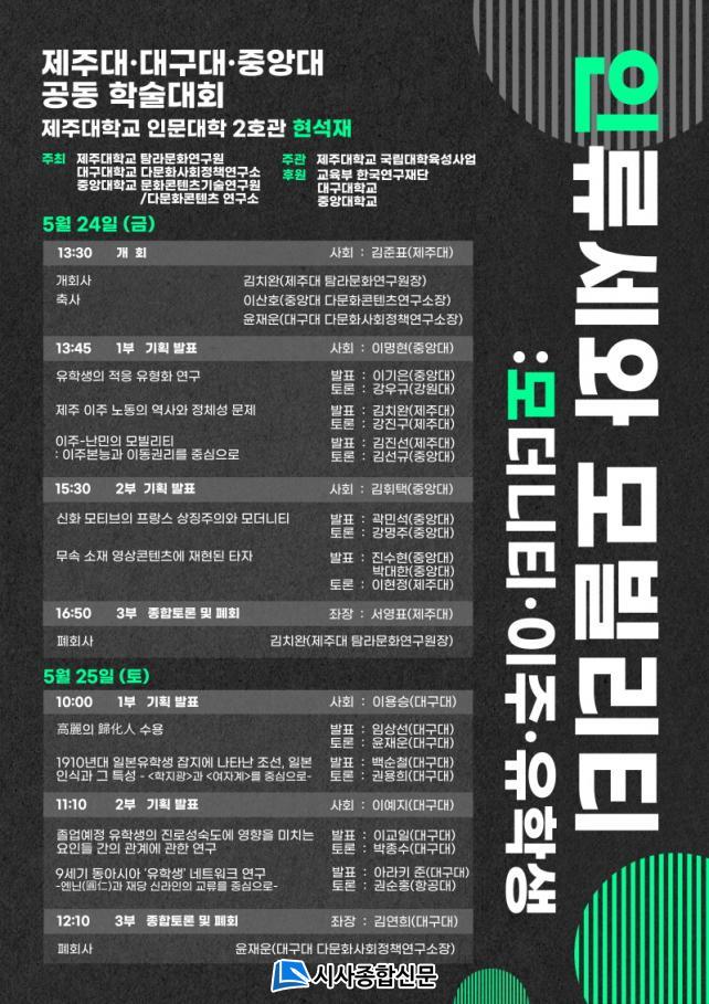 À̹ø Çмú´ëȸ´Â Á¦ÁÖ´ë ±¹¸³´ëÇÐÀ°¼º»ç¾÷°ú ±³À°ºÎ, Çѱ¹¿¬±¸Àç´ÜÀÇ Áö¿øÀ¸·Î °³ÃֵȴÙ. 3°³ ´ëÇÐ °øµ¿Çмú´ëȸ¸¦ ÁÖÃÖÇÏ´Â Á¦ÁÖ´ë Ž¶ó¹®È¿¬±¸¿øÀº ³¹Î°ú ¸ðºô¸®Æ¼, ¹®ÈÀû ´Ù¾ç¼º°ú Æ÷½ºÆ® ÈÞ¸Õ, Á¦ÁÖÇÐ µî Çö´ë »çȸÀÇ ´Ù¾çÇÑ ¿¬±¸ ÁÖÁ¦¸¦ Á¦ÁÖ ¹®È Á¤Ã¼¼ºÀ¸·Î ¼Õ²ÅÈ÷´Â ¡®Äñ´ÙÀι®ÇС¯ °³³äÀ» Åä´ë·Î Á¢±ÙÇϰí À̸¦ È®»êÇϱâ À§ÇÑ ´Ù¾çÇÑ ±³À°ÇÁ·Î±×·¥ ¿î¿µÇϰí ÀÖ´Ù.