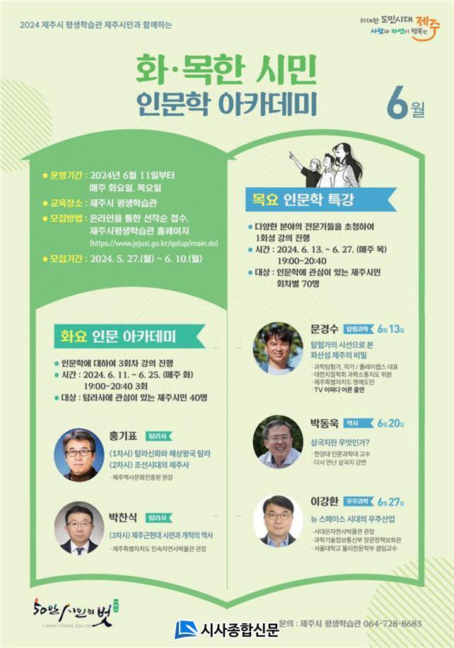 ¡®È¿äÀι® ¾ÆÄ«µ¥¹Ì¡¯´Â ¸ÅÁÖ È¿äÀÏ ¿ÀÈÄ 7½Ã¿¡ ÇѰ¡Áö Àι®ÇÐ ÁÖÁ¦¸¦ ¼±Á¤ÇØ 3ȸ¿¡ °ÉÃÄ ÁøÇàµÇ¸ç, 6¿ù 11ÀÏ, 18ÀÏ, 25ÀÏ¿¡¡®Å½¶ó °Ç±¹ ½ÅȺÎÅÍ ÇöÀç±îÁö¡¯¸¦ ÁÖÁ¦·Î Á¦ÁÖÀÇ ¿ª»ç¸¦ µÇ¤¾î º¸´Â °¿¬ÀÌ ÆîÃÄÁú ¿¹Á¤ÀÌ´Ù.