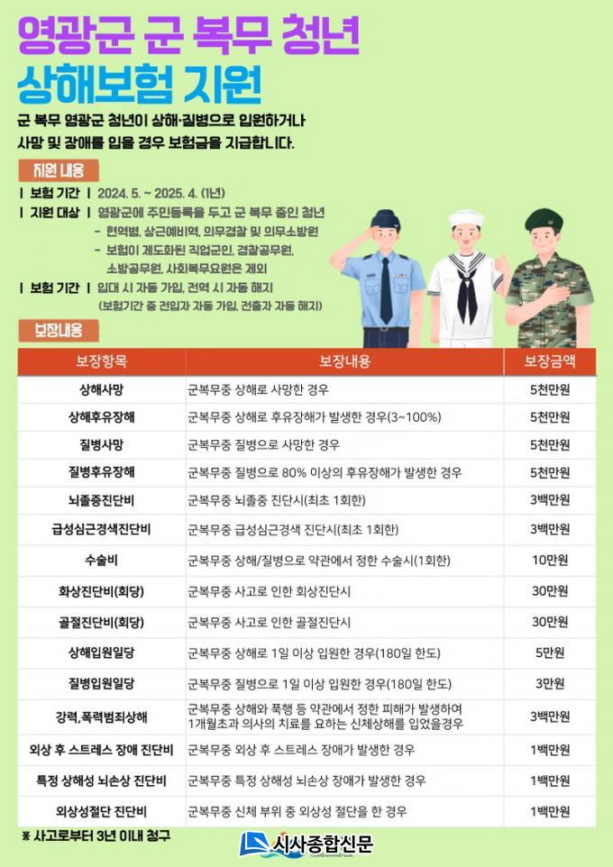Áö¿ø´ë»óÀº ¿µ±¤±º¿¡ ÁÖ¼Ò¸¦ µÎ°í ÀÖ´Â ±º º¹¹« ÁßÀΠû³âÀ¸·Î º´¿ª¹ý¿¡ µû¸¥ Çö¿ªº´, »ó±Ù¿¹ºñ¿ª, Àǹ«°æÂû ¹× Àǹ«¼Ò¹æ¿øÀÌ ÇØ´çµÇ¸ç, º¸ÇèÀÌ Á¦µµÈµÈ Á÷¾÷±ºÀÎ, °æÂû°ø¹«¿ø, ¼Ò¹æ°ø¹«¿ø, »çȸº¹¹«¿ä¿øÀº Á¦¿ÜµÈ´Ù.