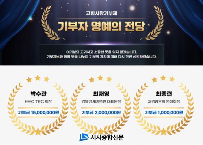 ÇÑÆí Áö³ 1¿ù Áö¿ª»ç¾÷ÀÚ ÀåÀç¿ë ´ëÇ¥¿Í 5¿ù ÃÖÀ翵 °ºÏ21¼¼±âº´¿ø ´ëÇ¥¿øÀåÀÌ °¢ 200¸¸ ¿øÀ», 2¿ù¿¡´Â ÃÖÁ¾·Ã ¿©¼ö½Ã Àç°æÇâ¿ìȸ ¸í¿¹È¸Àåµµ 100¸¸ ¿øÀ» ±âºÎÇÏ¸ç °íÇâ»ç¶û ±âºÎÁ¦¿¡ ÈûÀ» ½Ç¾ú´Ù.