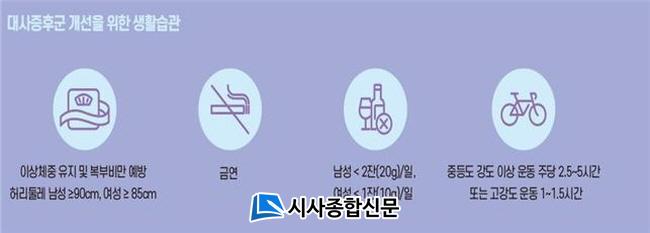 ´ë»çÁõÈıºÀº ÇÕº´ÁõÀÌ ¹ß»ýÇϱâ Àü¿¡´Â Áõ»óÀÌ ¾ø´Ù. ÇöÀç ±¹³»¿¡¼´Â NCEP(¹Ì±¹ ±¹°¡ ÄÝ·¹½ºÅ×·Ñ ±³À° ÇÁ·Î±×·¥) Áø´Ü ±âÁØ Áߺ¹ºÎºñ¸¸ ±âÁظ¸ Çѱ¹Àο¡ ¸ÂÃç »ç¿ëÇÏ´Â °æ¿ì°¡ ¸¹´Ù. ÀϹÝÀûÀ¸·Î ¾Æ·¡ÀÇ ±âÁØ Áß 3°¡Áö ÀÌ»ó¿¡ ÇØ´çµÇ¸é ´ë»çÁõÈıºÀ¸·Î Á¤ÀÇÇÑ´Ù. ´ë»çÁõÈıº Ä¡·áÀÇ ±Ã±ØÀûÀÎ ¸ñÇ¥´Â ´ç´¢º´, ½É³úÇ÷°üÁúȯ µîÀ» ¿¹¹æÇϰí ÀÌ·Î ÀÎÇÑ »ç¸ÁÀ» ÁÙÀÌ´Â °ÍÀÌ´Ù. ¶Ç ½ÄÀÌ¿ä¹ý, ¿îµ¿¿ä¹ýÀ» Æ÷ÇÔÇÑ »ýȰ½À°ü °³¼±À» ÅëÇØ ÀûÁ¤ üÁßÀ» À¯ÁöÇÏ´Â °ÍÀÌ Áß¿äÇÏ´Ù.