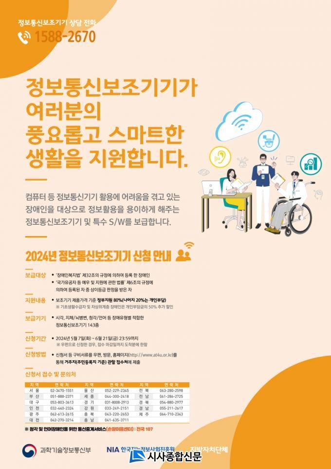 Àå¾ÖÀÎÀÌ Á¤º¸Åë½Å ±â¼ú¿¡ ½±°Ô Á¢±ÙÇϵµ·Ï Ư¼ö º¸Á¶±â±â¸¦ Àú·ÅÇÏ°Ô º¸±ÞÇÏ´Â Á¤º¸Åë½Åº¸Á¶±â±â º¸±Þ»ç¾÷Àº ÇöÀç Á¢¼ö¸¦ ÁøÇàÇϰí ÀÖ´Ù. Á¤º¸Åë½Åº¸Á¶±â±â ¿Â¶óÀÎ ½Åû ´©¸®Áý(www.at4u.or.kr)À̳ª ½Ã±º Á¤º¸È¾÷¹« ´ã´çºÎ¼¿¡ ¹æ¹®Çϰųª ÀüÀÚ¿ìÆíÀ¸·Î ¿À´Â 21ÀϱîÁö ½ÅûÇÏ¸é µÈ´Ù.