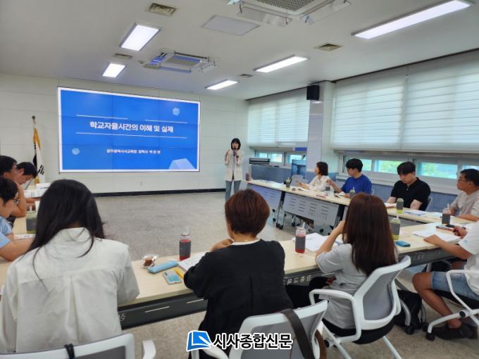 ±¸¼º¿ø Áß ÀÚÀ²½Ã°£ ¿¹½Ã °³¹ßÆÀÀ» Á¶Á÷ÇÏ¿© 5¿ù~6¿ù ÃʱîÁö »ýÅÂÀüȯ±³À° ÁÖÁ¦·Î °ú¸ñ °³¹ßÀ» ÁøÇàÇÏ¿´À¸¸ç, Ÿ½Ãµµ Àû¿ë »ç·Ê µîÀ» ºñ±³ ¿¬±¸Çϱâ À§ÇØ ±¤ÁÖ±¤¿ª½Ã±³À°Ã» ÁߵÀ°°úÁ¤ ´ã´ç ¹ÚÀº¿µ ÀåÇл縦 ÃÊ´ëÇÏ¿© ÇöÀå¿¡¼ ÀÚÀ²½Ã°£ Àû¿ë ¹× ½ÅÀÔ»ý ±³À°°úÁ¤ Æí¼º¿¡ ´ëÇØ ÇÔ²² °í¹ÎÇÏ´Â ½Ã°£À» °¡Á³´Ù.