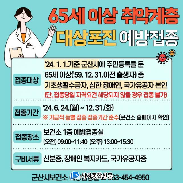 ÀÌ¿¡ µû¶ó, ±º»ê½Ã´Â Ãë¾à°èÃþÀÇ °æÁ¦Àû ºÎ´ã °æ°¨ ¹× Áúº´ ¿¹¹æÀ» À§ÇØ 2024³â 1¿ù 1ÀÏ ±âÁØ ±º»ê½Ã¿¡ Áֹεî·ÏÀ» µÐ 65¼¼(1959³â 12¿ù 31ÀÏ ÀÌÀü Ãâ»ýÀÚ) ÀÌ»ó Áß ±âÃÊ»ýȰ¼ö±ÞÀÚ, Àå¾ÖÀÇ Á¤µµ°¡ ½ÉÇÑ Àå¾ÖÀÎ, ±¹°¡À¯°øÀÚ º»ÀÎÀ» ´ë»óÀ¸·Î 1ȸ ¹«·á Á¢Á¾À» ÃßÁøÇÑ´Ù.