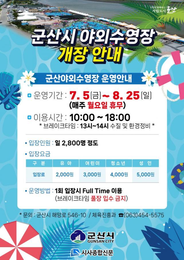 ±º»ê¾ß¿Ü¼ö¿µÀåÀº 7¿ù 5ÀϺÎÅÍ 8¿ù 25ÀϱîÁö °³ÀåÇϸç, Á¤±âÈÞ¹«ÀÎ ¿ù¿äÀÏÀ» Á¦¿ÜÇϰí È¿äÀÏ~ÀÏ¿äÀÏ, ¿ÀÀü 10½Ã~ ¿ÀÈÄ 6½Ã±îÁö ¿î¿µµÈ´Ù. ¿ÀÈÄ 1½Ã~2½Ã »çÀÌ¿¡´Â ¼öÁú ¹× ȯ°æÁ¤ºñ¸¦ À§ÇÑ ºê·¹ÀÌÅ© ŸÀÓÀÌ ÀÖ¾î ±× ½Ã°£À» Á¦¿ÜÇϰí´Â Ç®ÀåÀ» ǮŸÀÓÀ¸·Î ÀÌ¿ëÇÒ ¼ö ÀÖ´Ù.
