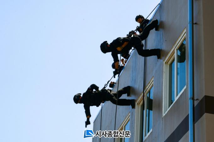 ÀÌ¾î¼ Ãѱ⸦ ¼ÒÁöÇÑ Å×·¯¹üµéÀÌ °Ç¹° ³»ºÎ¿¡¼ ÀÎÁú±ØÀ» ¹úÀÌ´Â »óȲÀ» °¡Á¤ÇÑ Á¾ÇÕ °Ý½Ç ¼ÒÅÁ ÈÆ·ÃÀ» ÅëÇØ ±ÙÁ¢ÀüÅõ±â¼úÀ» ¼÷´ÞÇÏ°í ´ëÅ×·¯ »óȲÁ¶Ä¡´É·ÂÀ» ±Ø´ëÈÇÏ¿´´Ù. °¢ ±ºÀÌ Çǵå¹éÀ» °øÀ¯ÇÏ°í ¹ßÀü¹æ¾ÈÀ» ÅäÀÇÇÏ´Â ½Ã°£À» ³¡À¸·Î ÈÆ·ÃÀ» ¸¶¹«¸®µÇ¾ú´Ù.