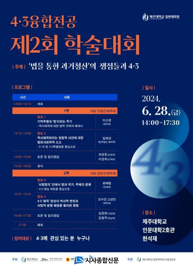 4¡¤3À¶ÇÕÀü°øÀÇ µÎ ¹øÂ° Çмú´ëȸ´Â ¡®¹ýÀ» ÅëÇÑ °ú°Åû»êÀÇ ÀïÁ¡µé°ú 4¡¤3¡¯ÀÇ ÁÖÁ¦·Î ¹ßÇ¥¿Í Åä·ÐÀ¸·Î ±¸¼ºµÆ´Ù. 1ºÎ´Â ¡ã±â¾ïÅõÀï°ú ¹ýÀ̶ó´Â ¹«±â: ¿ª»ç¿Ö°î¿¡ ´ëÇÑ ¹ýÀû ±ÔÁ¦ÀÇ ¿¹¿¡¼, ¡ã¡®¿ª»ç¿Ö°îÁ˶ó´Â ÀÔ¹ýÀû »ç°Ç¿¡ ´ëÇÑ ¹üÁË»çȸÇÐÀû ¼Ò°í: 5¡¤18 ¹× 4¡¤3Ưº°¹ýÀ» Áß½ÉÀ¸·Î¡¯ ¹ßÇ¥¸¦ ½ÃÀÛÀ¸·Î Åä·Ð°ú ÁúÀÇÀÀ´äÀÌ À̾îÁø´Ù. 2ºÎ¿¡¼´Â ¡ã»ç¹ýÁ¤ÀÇ ¾È¿¡¼ ¹ý°ú ±¹°¡, ÁÖüÀÇ ¹®Á¦: 4.3 Àç½É ÀçÆÇÀ» Áß½ÉÀ¸·Î, ¡ã4¡¤3 ¿Ö°î Çö»óÀÇ ¿ª»çÀû º¯Ãµ°ú »ç¹ýÀû ºÐÀï ÇØ°áÀ» µÑ·¯½Ñ ÀïÁ¡ ¹ßÇ¥¡¤Åä·Ð°ú ÇÔ²² ÁúÀÇÀÀ´äÀ¸·Î ¸¶¹«¸®µÈ´Ù.