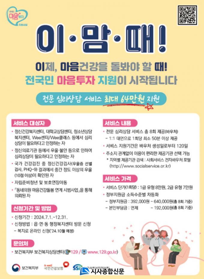 ¡®Àü±¹¹Î ¸¶À½ÅõÀÚ Áö¿ø¡¯Àº ±¹¹ÎÀÇ ¸¶À½ °Ç° µ¹º½Àº ¹°·Ð ÀÚ»ì ¿¹¹æ ¹× Á¤½ÅÁúȯ Á¶±â ¹ß°ßÀ» À§ÇØ ¿ì¿ï, ºÒ¾È µî Á¤¼Àû ¾î·Á¿òÀÌ ÀÖ´Â ±¹¹Î¿¡°Ô ½É¸®»ó´ã ¼ºñ½º¸¦ Áö¿øÇÏ´Â »ç¾÷ÀÌ´Ù.