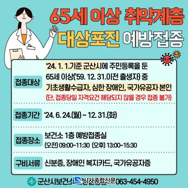 Á¢Á¾ ´ë»óÀº 2024³â 1¿ù 1ÀÏ ±âÁØ ±º»ê½Ã¿¡ Áֹεî·ÏÀ» µÐ 65¼¼(1959³â 12¿ù 31ÀÏ ÀÌÀü Ãâ»ýÀÚ) ÀÌ»ó Áß ±âÃÊ»ýȰ¼ö±ÞÀÚ, Àå¾ÖÀÇ Á¤µµ°¡ ½ÉÇÑ Àå¾ÖÀÎ, ±¹°¡À¯°øÀÚ º»ÀÎÀ̸ç, °ú°Å ´ë»óÆ÷Áø ¿¹¹æÁ¢Á¾ ±â·ÏÀÌ Àְųª ¸é¿ª ÀúÇÏÀÚ µî ´ë»óÆ÷Áø Á¢Á¾ ±Ý±âÀÚ´Â Á¢Á¾ ´ë»ó¿¡¼ Á¦¿ÜµÈ´Ù.
