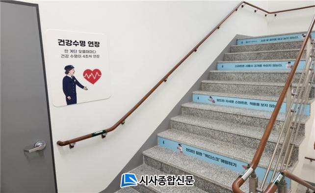 ¾Æ¿ï·¯ ÀÏ»ó ¼Ó °Ç°»ýȰ½ÇõÀ» Ȱ¼ºÈÇϱâ À§ÇØ °è´Ü ÀÌ¿ë ½Ã °Ç°ÁõÁø È¿°ú, Ä®·Î¸® ¼Òºñ·®, °Ç°»ýȰ½Çõ»ç¾÷(ºñ¸¸¿¹¹æ, ÀýÁÖ, ±Ý¿¬, ±¸°°ü¸® µî)ÀÇ Á¤º¸°¡ Ç¥½ÃµÈ ½ºÆ¼Ä¿¸¦ °è´Ü°ú ¿¤¸®º£ÀÌÅÍ µî¿¡ ºÎÂøÇß´Ù.