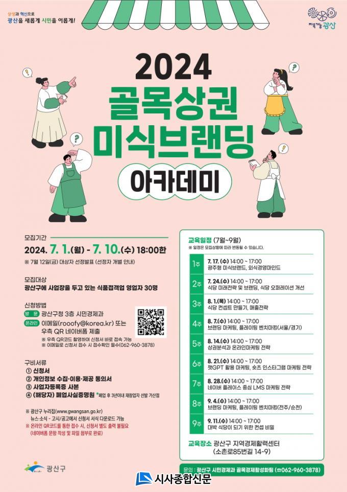 Âü¿© ´ë»óÀº ±¤»ê±¸¿¡ »ç¾÷ÀåÀ» ±¤»ê±¸¿¡ »ç¾÷ÀåÀ» µÐ ½ÄǰÁ¢°´¾÷(¿ä½Ä¾÷) ¿µ¾÷ÀÚ 30¸íÀÌ´Ù. ¾ÆÄ«µ¥¹Ì´Â 7¿ùºÎÅÍ 9¿ù±îÁö 9ÁÖ °úÁ¤À¸·Î ¸ÅÁÖ 1ȸ 3½Ã°£¾¿ ±¤»ê±¸ Áö¿ª°æÁ¦È°·Â¼¾ÅÍ 2Ãþ(¼ÒÃÌ·Î85¹ø±æ 14-9)¿¡¼ ÁøÇàÇÑ´Ù.