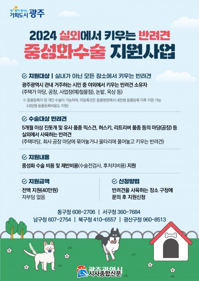 Áö¿ø ´ë»óÀº ±¤ÁÖ±¤¿ª½Ã¿¡ ÁÖ¼ÒÁö¸¦ µÎ°í ½Ç°ÅÁÖÇϰí ÀÖ´Â ½Ç¿Ü»çÀ°°ß ¼ÒÀ¯ÀÚ´Ù. µ¿¹°µî·ÏÀ» ÇØ¾ß Áß¼ºÈ ¼ö¼úÀ» Áö¿ø¹ÞÀ» ¼ö ÀÖÀ¸¸ç, ¹Ìµî·Ï µ¿¹°Àº µî·Ï°ú »çÀü°Ë»ç¸¦ ÁøÇàÇÑ ÈÄ Áß¼ºÈ ¼ö¼úÀ» ÇÏ°Ô µÈ´Ù.