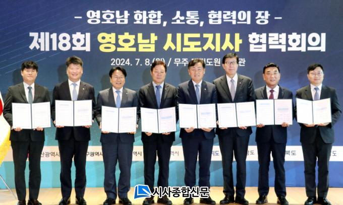 Àü¶ó³²µµ¿Í ÀüºÏÀÚÄ¡µµ, ±¤ÁÖ±¤¿ª½Ã, °æ»ó³²µµ, °æ»óºÏµµ, ´ë±¸±¤¿ª½Ã, ºÎ»ê±¤¿ª½Ã, ¿ï»ê±¤¿ª½Ã´Â 8ÀÏ ÀüºÏ ¹«ÁÖ¿¡¼ Á¦18ȸ ¿µÈ£³²½ÃµµÁö»çÇù·ÂȸÀǸ¦ ¿¾î °øµ¿ Á¤Ã¥ Çù·Â°úÁ¦(8°³)¿Í Áö¿ª±ÕÇü¹ßÀü °ÇÀǰúÁ¦(8°³)¸¦ ´ãÀº °øµ¿¼º¸í¼¸¦ ¹ßÇ¥Çß´Ù.