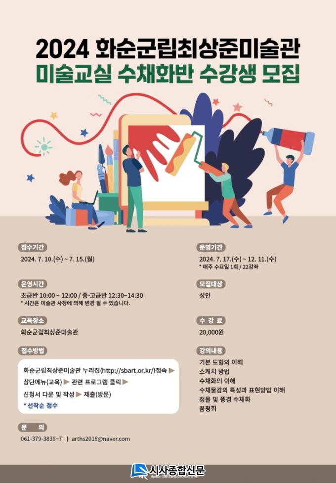 ¼ºÀÎ ¹Ì¼ú±³À° ÇÁ·Î±×·¥ ¡®¹Ì¼ú ±³½Ç¡¯ ¼öÃ¤È ¹ÝÀº 7¿ù 17ÀϺÎÅÍ ¸ÅÁÖ ¼ö¿äÀÏ ÃÖ»óÁع̼ú°ü ±³À°Ã¢À۽ǿ¡¼ ÁøÇàµÈ´Ù. °Á ½Ã°£Àº ÃÊ±Þ¹Ý 10:00~12:00±îÁö, Áß±Þ¹Ý 12:30~15:30±îÁö ÁøÇàµÇ°í, ¸ðÁýÀοøÀº ¹Ýº°·Î 10¸í¾¿ ÃÑ 20¸íÀ̸ç, ¼ö°·á´Â 2¸¸ ¿øÀÌ´Ù.