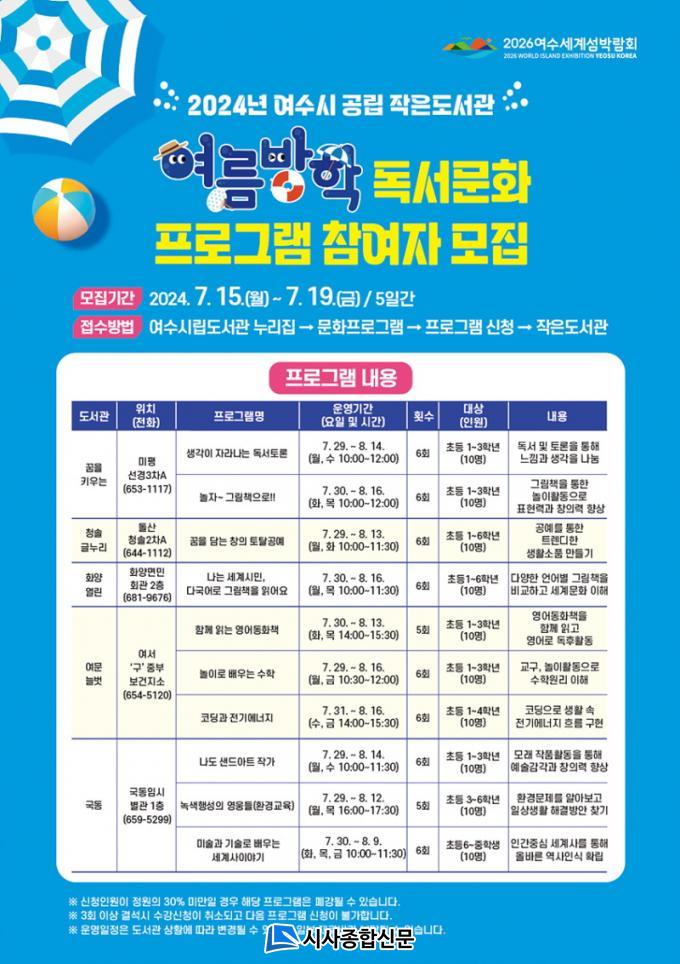 ¿À´Â 15ÀϺÎÅÍ 19ÀϱîÁö ¿©¼ö½Ã¸³µµ¼°ü ´©¸®Áý(http://yslib.yeosu.go.kr)¿¡¼ ¿Â¶óÀÎÀ¸·Î ½ÅûÇϰųª Âü¿©¸¦ ¿øÇÏ´Â ÀÛÀºµµ¼°üÀ¸·Î ÀüÈ ¶Ç´Â ¹æ¹® ½ÅûÇÏ¸é µÈ´Ù.