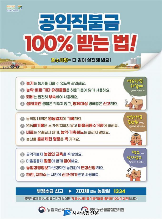 2020³â¿¡ µµÀÔµÈ °øÀÍÁ÷ºÒÁ¦´Â ³ó¾÷․³óÃÌÀÇ °øÀÍÀû ±â´ÉÀ» ÁõÁøÇÏ¸é¼ ³ó¾÷¿¡ Á¾»çÇÏ´Â ³ó¾÷ÀÎÀÇ ¼Òµæ¾ÈÁ¤À» µ½±â À§ÇØ Á÷ºÒ±ÝÀ» Áö¿øÇÏ´Â Á¦µµ´Ù. Á÷ºÒ±ÝÀ» 100% ¹Þ±â À§Çؼ´Â ³ó°¡°¡ ¹ý·É¿¡¼ Á¤ÇÑ 17°¡Áö Àǹ« Áؼö»çÇ×À» ¸ðµÎ ½ÇÃµÇØ¾ß ÇÑ´Ù.