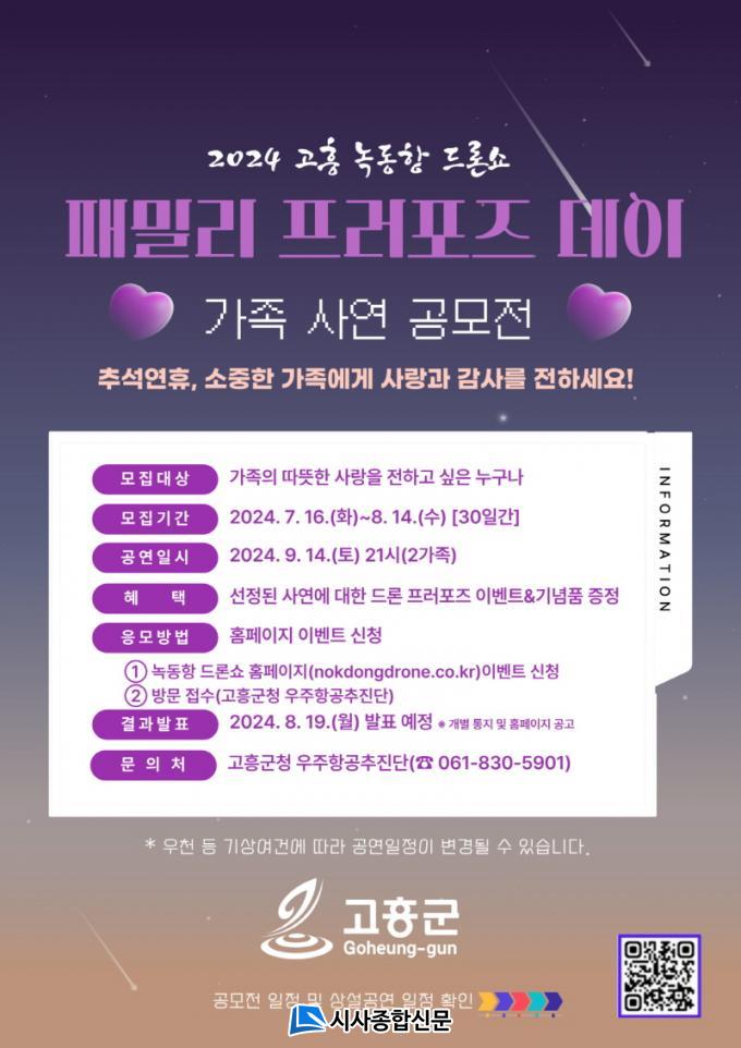 Çà»ç´Â 2°¡Á·À» ¼±Á¤ÇØ ¿À´Â 9¿ù 14ÀÏ(Åä) ¿ÀÈÄ 9½Ã, »ç¿¬¿¡ ´ëÇÑ µå·Ð ÇÁ·¯Æ÷Áî À̺¥Æ® °ø¿¬°ú ±â³äǰÀ» Á¦°øÇÒ ¿¹Á¤ÀÌ´Ù. ÀÚ¼¼ÇÑ ³»¿ëÀº °íÈﱺ ´ëÇ¥ ´©¸®Áý(https://www.goheung.go.kr), ³ìµ¿Ç× µå·Ð¼î ȨÆäÀÌÁö(http://nokdongdrone.co.kr) ¹× ÀνºÅ¸±×·¥(@nokdongdroneshow_official) µîÀ» ÅëÇØ È®ÀÎÇÒ ¼ö ÀÖ´Ù.
