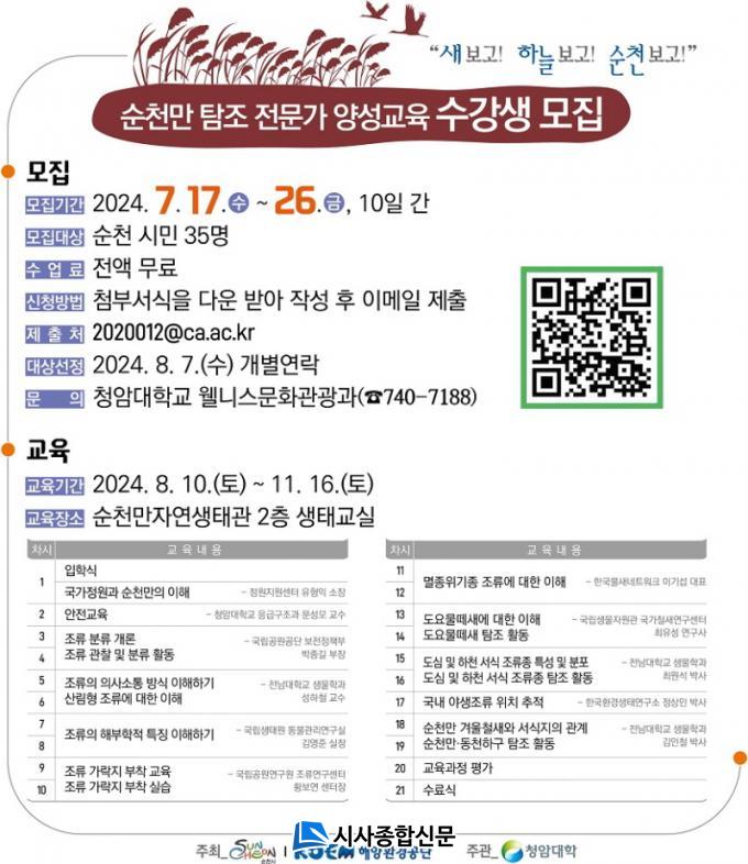±³À°»ý ¸ðÁýÀº û¾Ï´ëÇб³¿¡¼ ÁÖ°üÇÏ¸ç ¸ðÁý ÀοøÀº ÃÑ 35¸íÀÌ´Ù. ¸ðÁý´ë»óÀº ¼øÃµ °ü³» °ÅÁÖÇÏ°í »õ¿¡ °ü½É ÀÖ´Â 19¼¼ ÀÌ»ó ¼ºÀÎÀÌ¸é ´©±¸³ª Áö¿øÇÒ ¼ö ÀÖ´Ù. ½Åû¹æ¹ý ¹× ¼¼ºÎ»çÇ×Àº ¼øÃµ¸¸½ÀÁö ´©¸®Áý °øÁö»çÇ׿¡¼ È®ÀÎÇÒ ¼ö ÀÖÀ¸¸ç, ¸ðµç ±³À° °úÁ¤Àº ¹«·á·Î ÁøÇàµÈ´Ù.