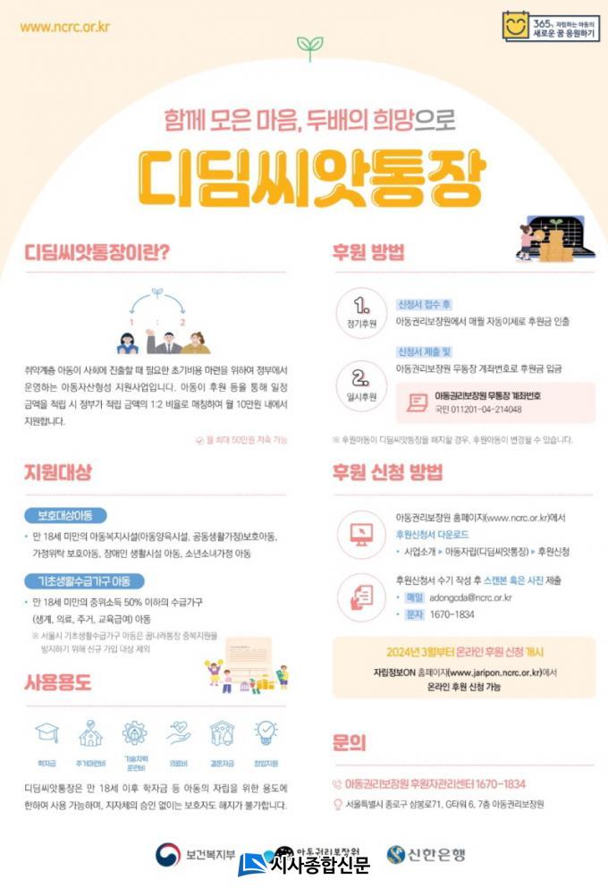 µðµõ¾¾¾ÑÅëÀåÀº Ãë¾à°èÃþ ¾Æµ¿ÀÌ »çȸ¿¡ ÁøÃâÇÒ ¶§ ÇÊ¿äÇÑ Ãʱâºñ¿ë ¸¶·ÃÀ» À§ÇÏ¿© Á¤ºÎ¿¡¼ ¿î¿µÇÏ´Â ¾Æµ¿ ÀÚ»êÇü¼º Áö¿ø »ç¾÷À̸ç, ¾Æµ¿ Àû¸³±Ý ¿ù 5¸¸ ¿ø ³»ÀÇ ¹üÀ§¿¡¼ 1:2·Î ¸ÅĪÇÏ¿© ±¹°¡°¡ ¿ù ÃÖ´ë 10¸¸ ¿ø±îÁö Áö¿øÇÏ°Ô µÈ´Ù.