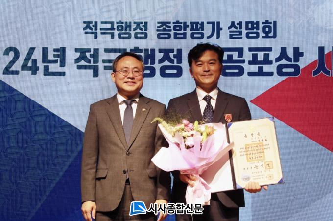 Áö³ 11ÀÏ Á¤ºÎ¼¼Á¾Ã»»ç Áß¾Óµ¿ ´ë°´ç¿¡¼ ¿¸° ¡®Àû±ØÇàÁ¤ À¯°ø Á¤ºÎÆ÷»ó¡¯ ¼ö¿©½Ä¿¡¼ °í±âµ¿ ÇàÁ¤¾ÈÀüºÎ Â÷°üÀº Àå¸íÈ »ç¹«°ü¿¡°Ô Á¤ºÎ Æ÷»óÀ» ¼ö¿©Çß´Ù. ¿ÃÇØ ¼ö»óÀÚ´Â ±¤ÁÖ½Ã ÈÆÀå 1¸íÀ» Æ÷ÇÔÇØ ÃÑ 17¸í(ÈÆÀå 2, Æ÷Àå 3, ´ëÅë·Éǥâ 2, ±¹¹«ÃѸ®Ç¥Ã¢ 2, Àå°üǥâ 8)¿¡°Ô ¼ö¿©Çß´Ù.