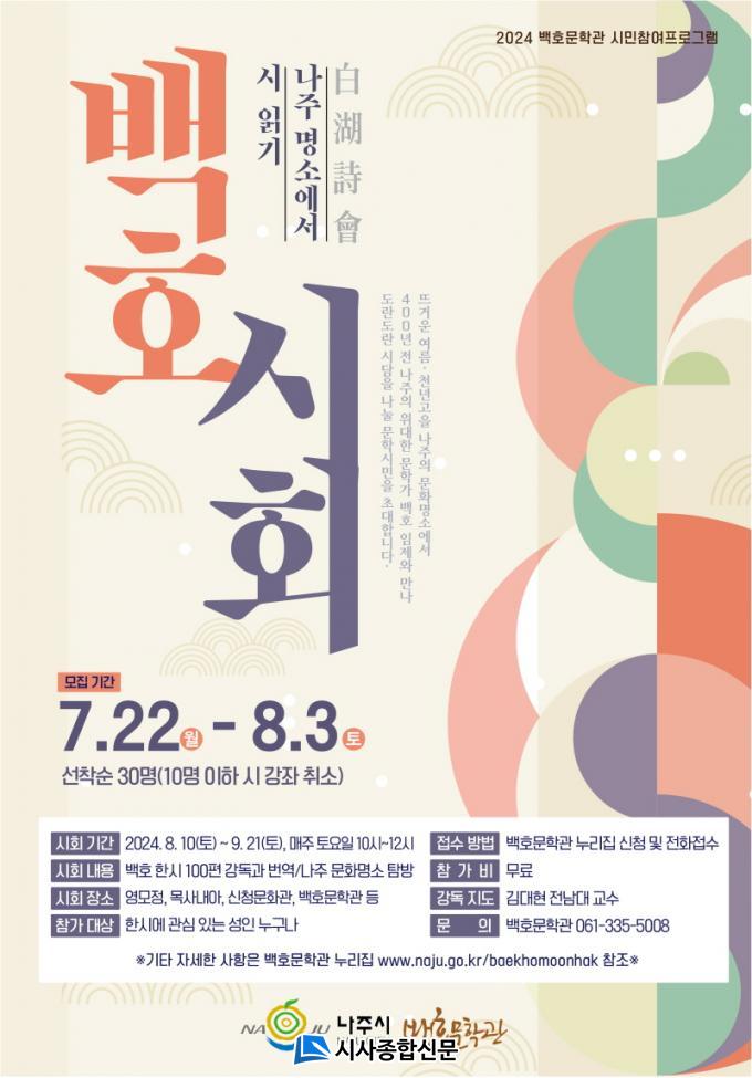 ³ªÁÖ½Ã(½ÃÀå À±º´ÅÂ)´Â ¹éÈ£¹®Çаü ¡®¹éÈ£½Ãȸ¡¯(ÛÜûÉãÌüå) Âü¿© ¼ö°»ý 30¸íÀ» 8¿ù 3ÀϱîÁö ¸ðÁýÇÑ´Ù°í 23ÀÏ ¹àÇû´Ù. ¹éÈ£½Ãȸ´Â Çѹ®À¸·Î ½áÁ® ¾î·Æ°Ô ´À²¸Áö´Â Çѽà ÀÛǰÀ» Çö´ëÀÎÀÇ ´«³ôÀÌ¿¡ ¸ÂÃç ÀçÇØ¼®ÇÏ´Â ÀÚ¸®·Î ¸¶·ÃµÈ´Ù.