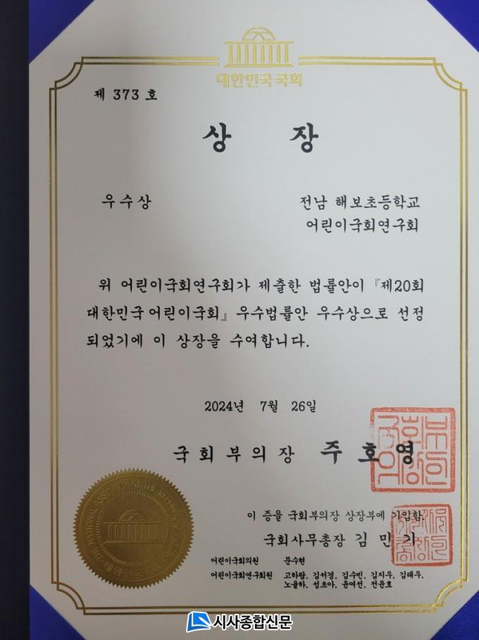 | ÇÔÆò ÇØº¸ÃʵîÇб³, 2³â ¿¬¼Ó ¡®´ëÇѹα¹¾î¸°À̱¹È¸ ±¹È¸ºÎÀÇÀå»ó¡¯ ¼ö»ó |