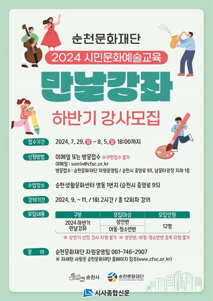 [½Ã»çÁ¾ÇսŹ® = Àå¹Î±Ô ±âÀÚ] (Àç)¼øÃµ¹®ÈÀç´Ü(ÀÌ»çÀå ³ë°ü±Ô)Àº 8¿ù 5ÀϱîÁö ½Ã¹Î¹®È¿¹¼ú±³À° ¸¸³¯°Á ÇϹݱâ ÇÁ·Î±×·¥À» ¿î¿µÇÒ °»ç¸¦ ¸ðÁýÇÑ´Ù°í ¹àÇû´Ù.