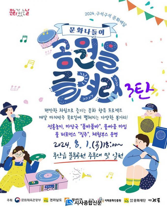 ¡®°ø¿¬À» Áñ°Ü¶ó¡¯´Â ¹®ÈüÀ°°ü±¤ºÎÀÇ ¡®2024 ¹®È°¡ ÀÖ´Â ³¯ ±¸¼®±¸¼® ¹®È¹è´Þ¡¯ °ø¸ð»ç¾÷¿¡ ¼±Á¤µÇ¾î ÁøÇàÇÏ´Â Çà»ç·Î ¹®ÈüÀ°°ü±¤ºÎ, Àü¶ó³²µµ, ¹«¾È±ºÀÌ ÁÖÃÖÇϰí Áö¿ª¹®ÈÁøÈï¿ø, Àü³²¹®ÈÀç´Ü, ±Ø´Ü°¹µ¹ÀÌ ÁÖ°üÇÑ´Ù.