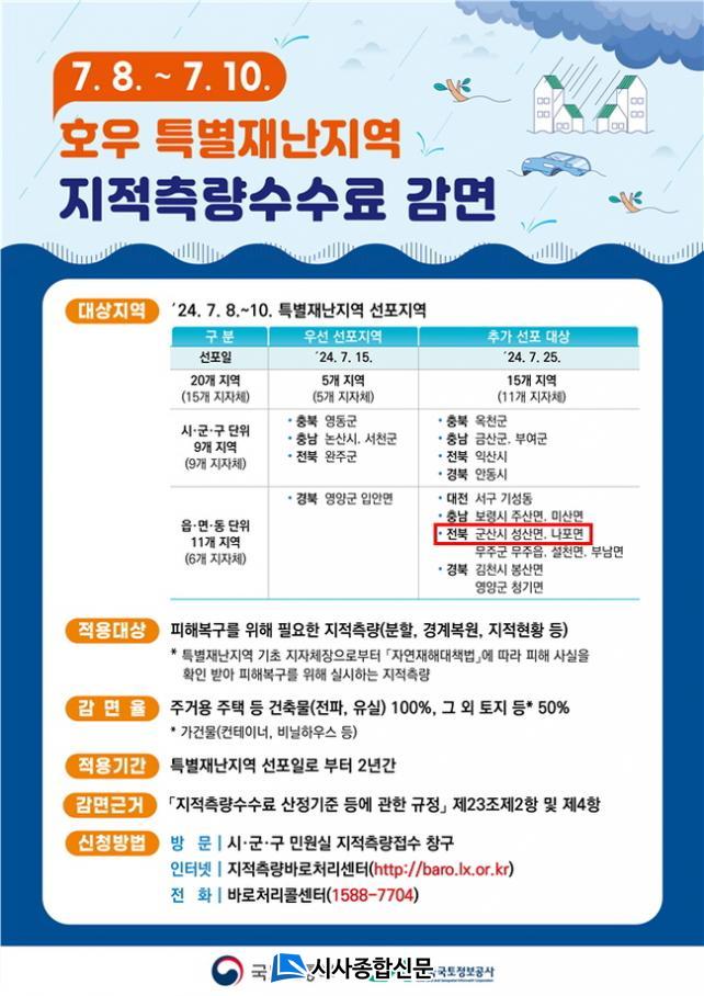 [½Ã»çÁ¾ÇսŹ® = ¿À½ÂÅà ±âÀÚ] ±º»ê½Ã°¡ Áö³ 7¿ù 25ÀÏ, ÁýÁßÈ£¿ì ÇÇÇØ Ưº°Àç³Áö¿ªÀ¸·Î Ãß°¡ ¼±Æ÷µÈ ±º»ê½Ã ¼º»ê¸é, ³ªÆ÷¸é ¼öÇØ ÅäÁö¿¡ ´ëÇÏ¿© ÁöÀûÃø·® ¼ö¼ö·á¸¦ 50%~100% °¨¸éÀ» ½ÃÇàÇϱâ·Î Çß´Ù.
