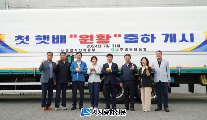 ¹Úâȯ Àü¶ó³²µµ °æÁ¦ºÎÁö»ç, ±èÇà¶õ ³ó¾÷±â¼ú¿øÀå, ¹Ú¼È« ³óÇù°æÁ¦ÁöÁÖ ´ëÇ¥ÀÌ»ç, À̵¿Èñ ³ªÁÖ¹è¿ø¿¹³óÇù Á¶ÇÕÀå µî 30¿© ¸íÀÌ ÇÔ²² Âü¼®ÇÑ °¡¿îµ¥ À±º´Å ³ªÁÖ½ÃÀåÀº ¼Û¹Ì·É Àå°ü°ú ÇÔ²² °ú¼ö¿øÀ» µÑ·¯º¸¸ç ¹è¸¦ Á÷Á¢ ¼öÈ®ÇÏ°í ¿ÃÇØ ¹è ÀÛȲ°ú ǰÁú¿¡ ´ëÇÑ À̾߱⸦ ³ª´³´Ù.