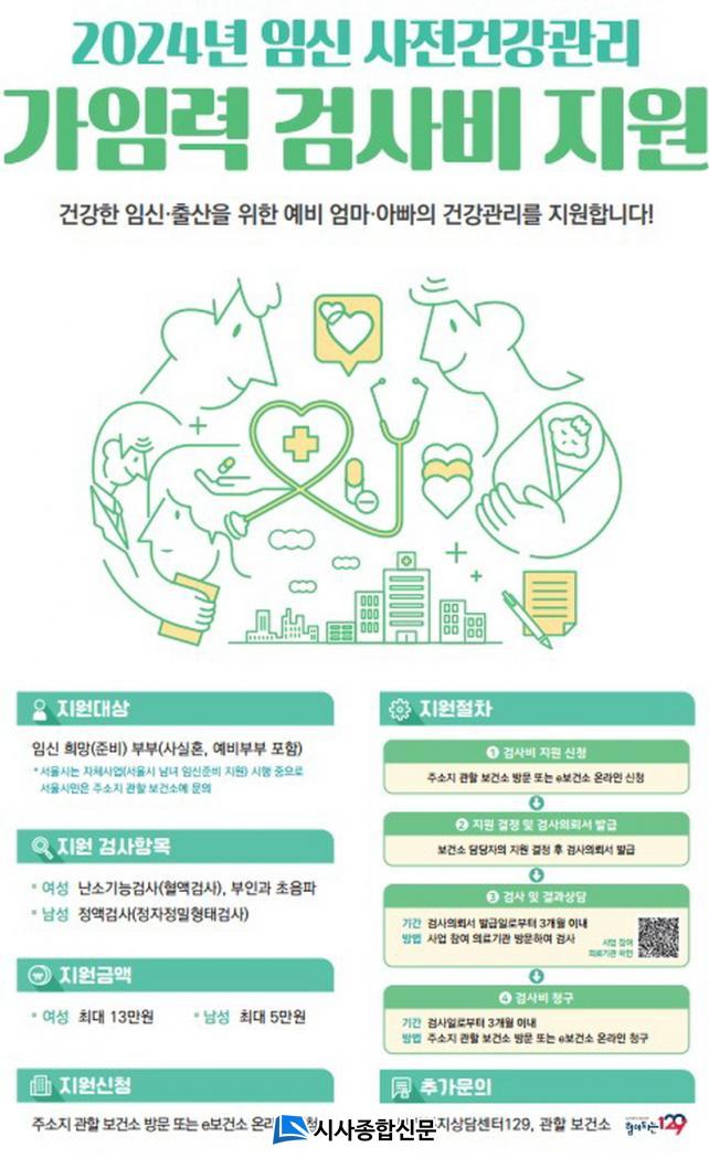 ÀӽŠÀü Çʼö °¡ÀÓ·Â °Ë»çºñ¸¦ Áö¿øÇÏ´Â »ç¾÷À¸·Î, ¿©¼ºÀº ³¼Ò±â´É°Ë»ç(AMH)¿Í ºÎÀΰú ÃÊÀ½ÆÄ °Ë»ç ºñ¿ëÀ» ÃÖ´ë 13¸¸¿ø±îÁö Áö¿øÇϰí, ³²¼ºÀº Á¤¾×°Ë»ç(Á¤ÀÚÁ¤¹ÐÇüŰ˻ç) ºñ¿ëÀ» ÃÖ´ë 5¸¸¿ø±îÁö Áö¿øÇÑ´Ù.