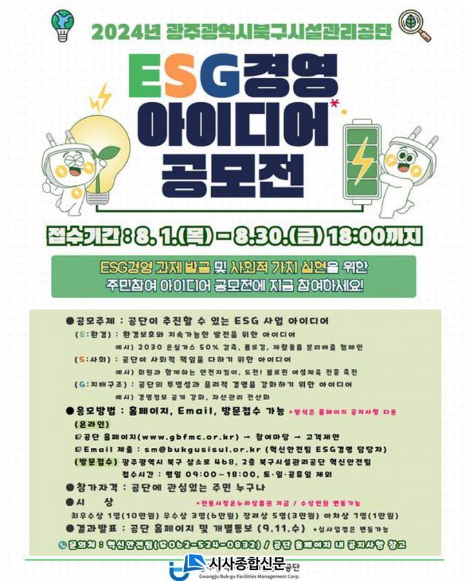 ESG°æ¿µ ¾ÆÀ̵ð¾î °ø¸ð´Â °ø´Ü »ç¾÷ ¿î¿µ¿¡ °ü½É ÀÖ´Â ´©±¸³ª Âü¿©ÇÒ ¼ö ÀÖÀ¸¸ç, °ø´Ü ȨÆäÀÌÁö¿¡¼ Á¦Ãâ ¼·ù¸¦ ´Ù¿î¹Þ¾Æ ÀÛ¼ºÇÑ ÈÄ 8¿ù 30ÀϱîÁö ¡ãȨÆäÀÌÁö-°í°´Á¦¾È ¡ãÀ̸ÞÀÏ(sm@bukgusisul.or.kr) ¡ã¹æ¹®Á¢¼ö(±¤ÁÖ±¤¿ª½Ã ºÏ±¸ »ï¼Ò·Î 468, 2Ãþ Çõ½Å¾ÈÀüÆÀ)·Î Á¦ÃâÇÏ¸é µÈ´Ù.