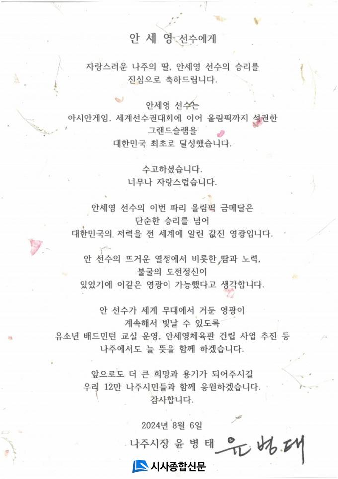 [½Ã»çÁ¾ÇսŹ® = ¿À½ÂÅà ±âÀÚ] À±º´Å ³ªÁÖ½ÃÀåÀÌ ¡®2024 ÆÄ¸®¿Ã¸²ÇÈ ¹èµå¹ÎÅÏ ¿©ÀÚ ´Ü½Ä¡¯¿¡¼ ±Ý¸Þ´ÞÀ» ȹµæÇÑ ³ªÁÖ Ãâ½Å ¾È¼¼¿µ ¼±¼ö¿¡°Ô 12¸¸ ³ªÁֽùÎÀÇ ¸¶À½À» ´ã¾Æ ÃàÀüÀ» º¸³Â´Ù.